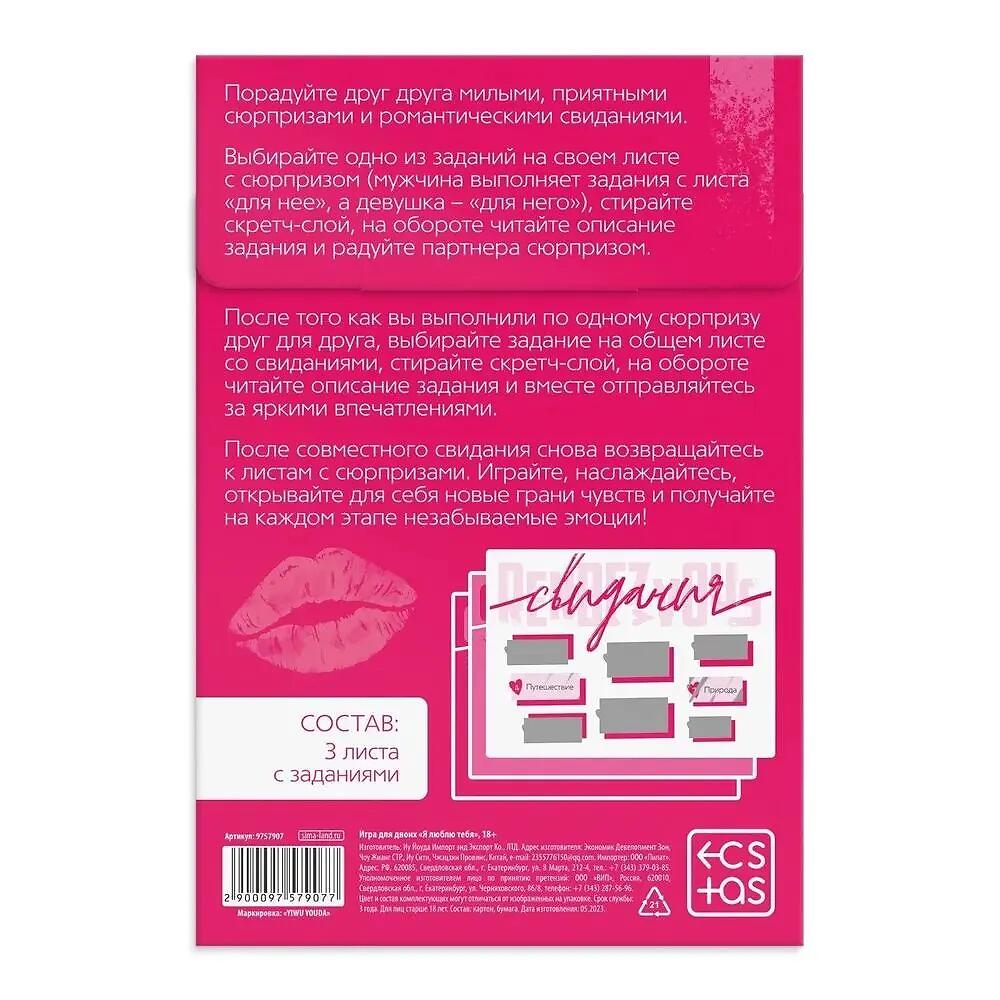Не упустите шанс подарить особенный вечер вместе с игрой "Я тебя люблю". Приобретите её уже сегодня и начните свое путешествие по глубинам взаимопонимания и любви!
