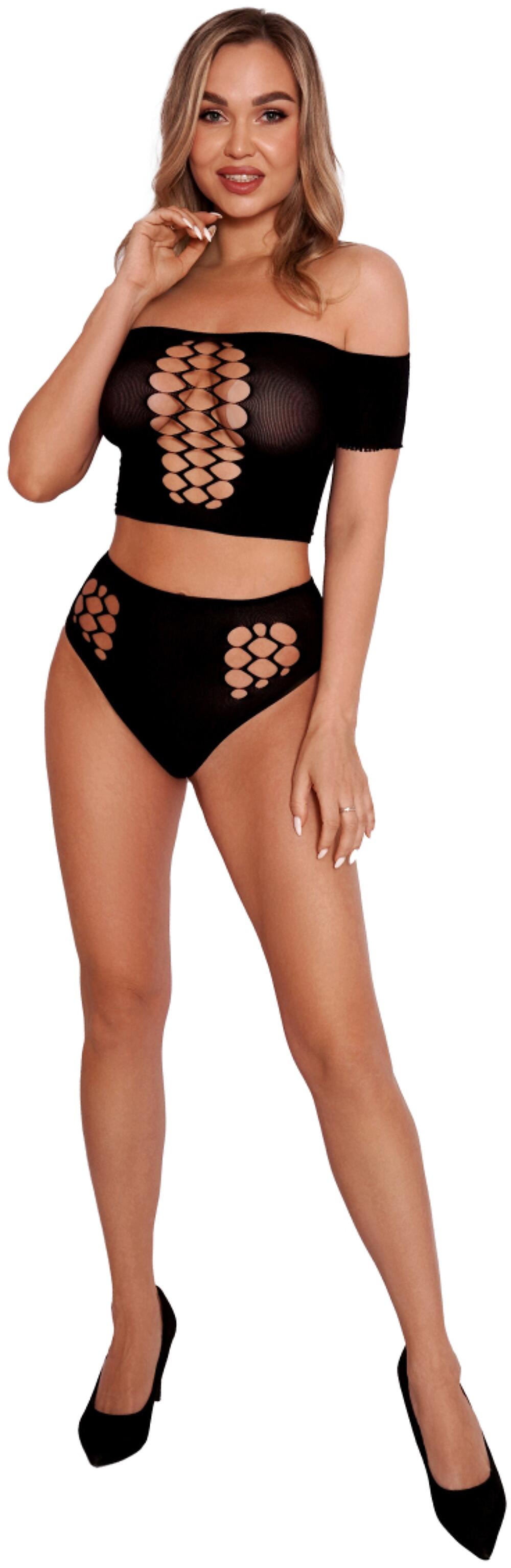 Комплект соблазнительного белья, состоящего из топа и трусиков, украшенных шнуровкой.