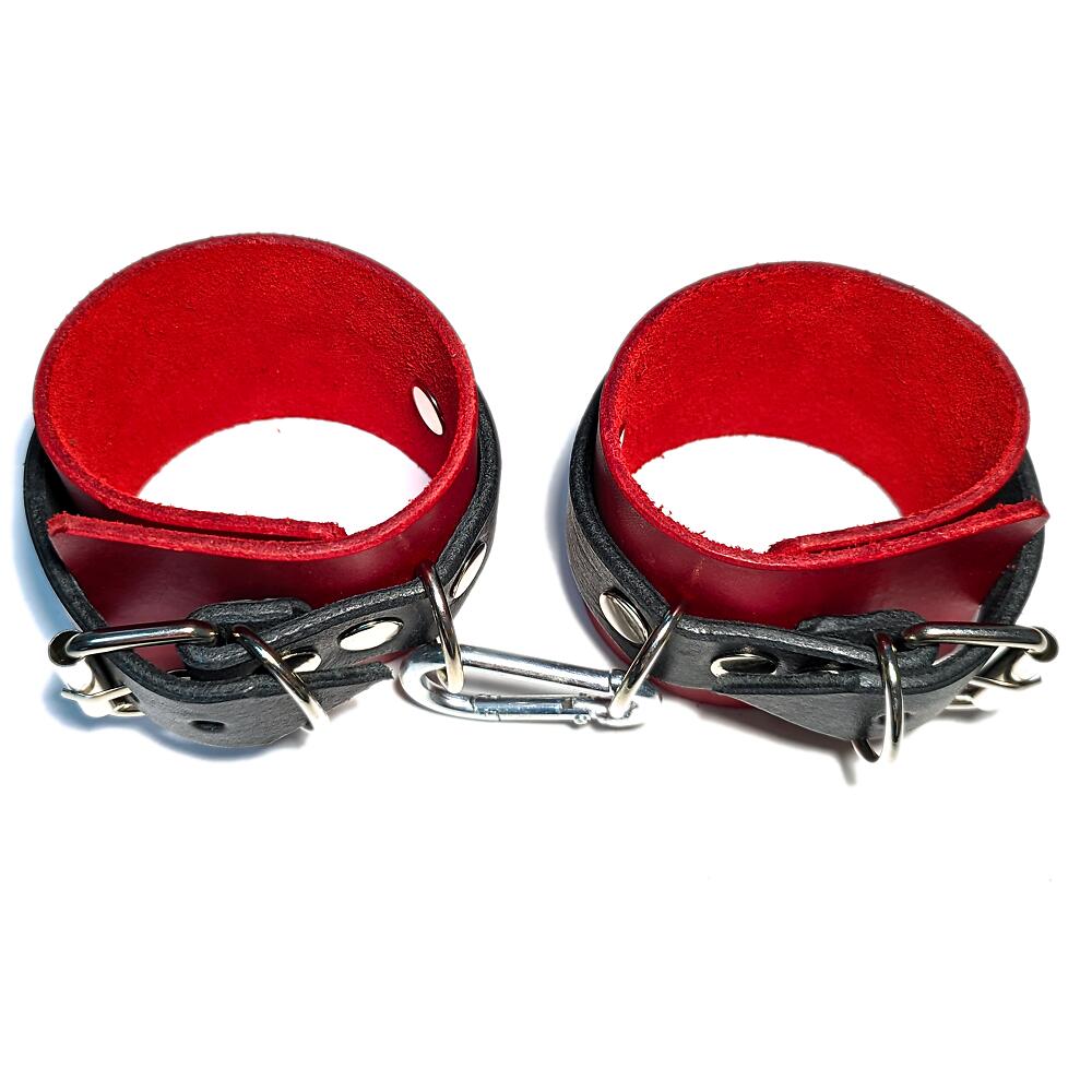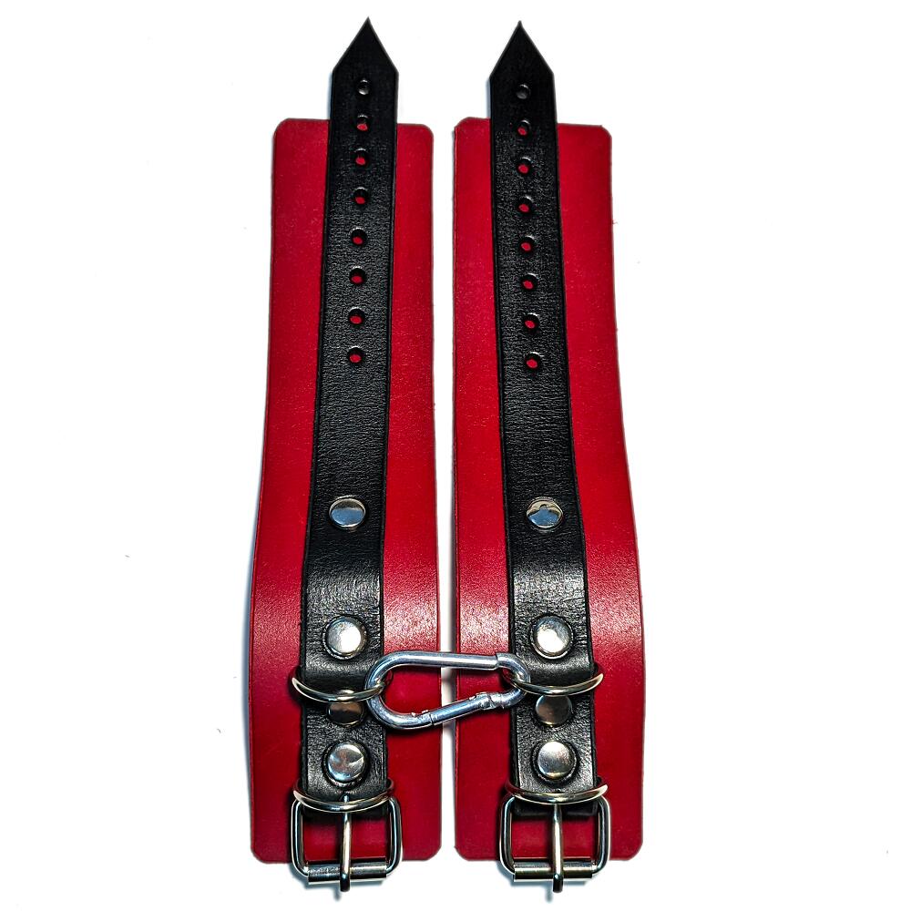 Наши наручники изготовлены из натуральной жесткой толстой кожи красного цвета, что придает им элегантность и сексуальность. Черные ремни добавляют контраст и создают смелый образ. Они снабжены сцепкой с карабинами, что обеспечивает надежную фиксацию и возможность быстрого освобождения в нужный момент.