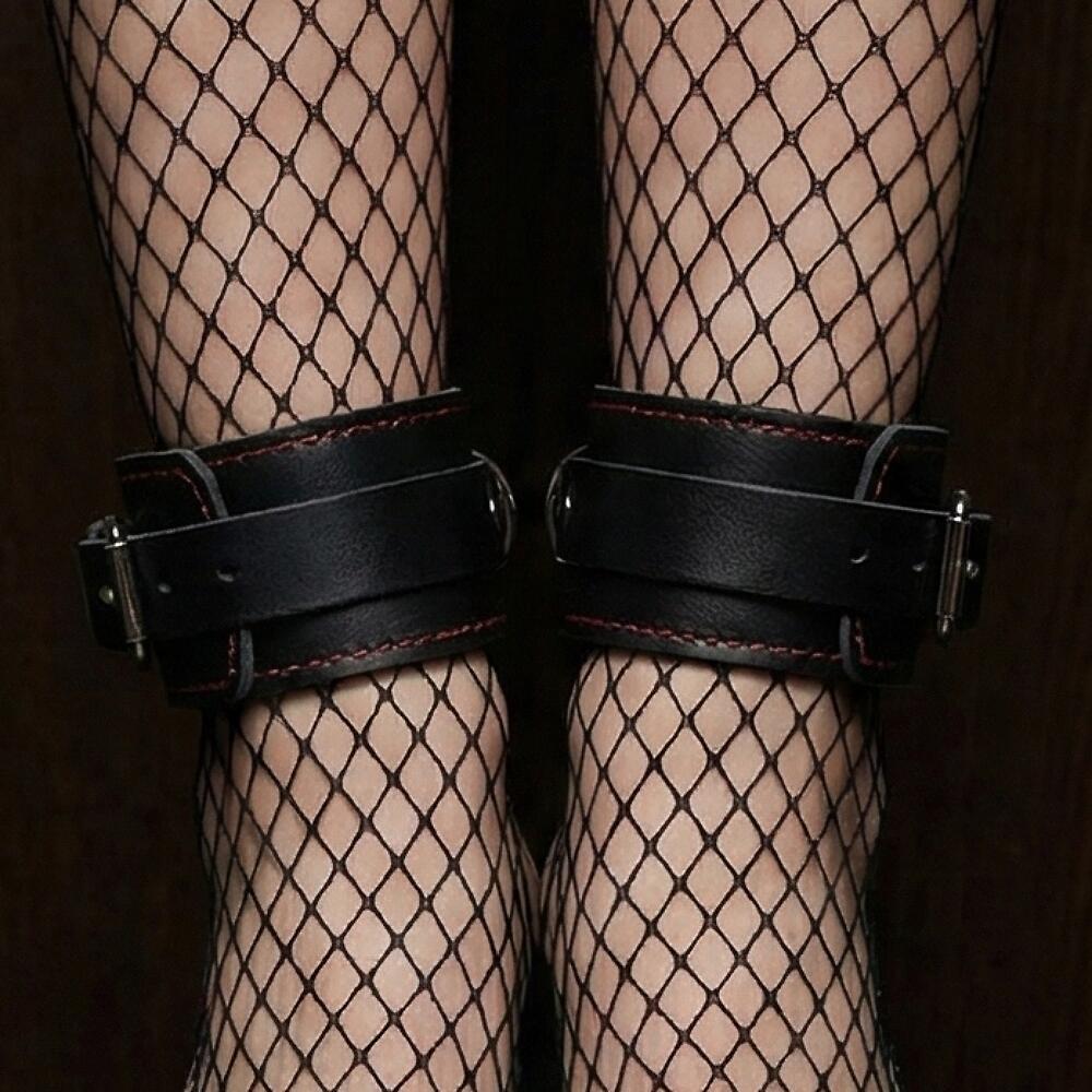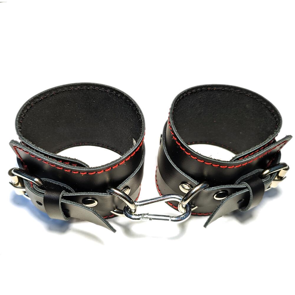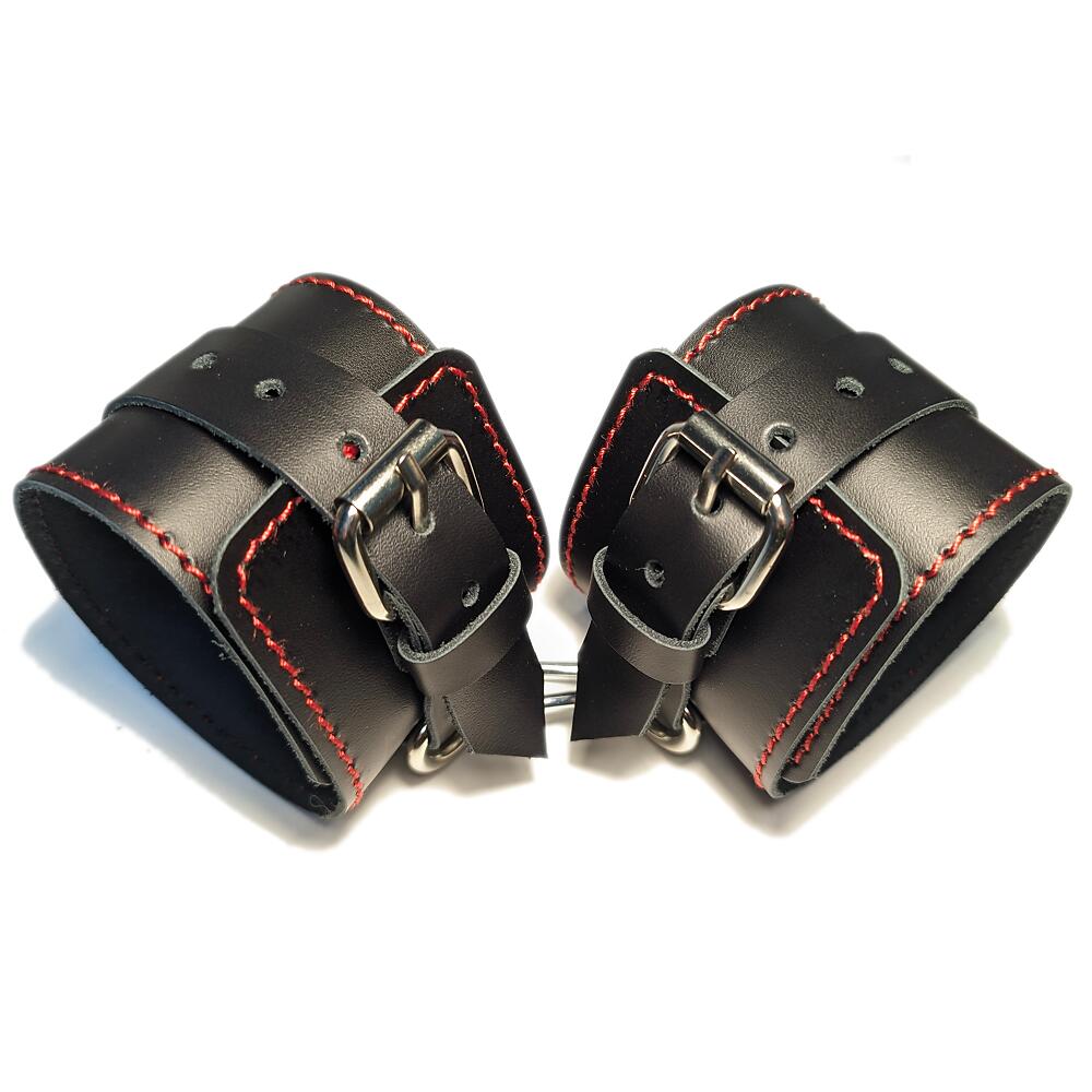 Наручники изготовлены из натуральной кожи чёрного цвета с красноё строчкой