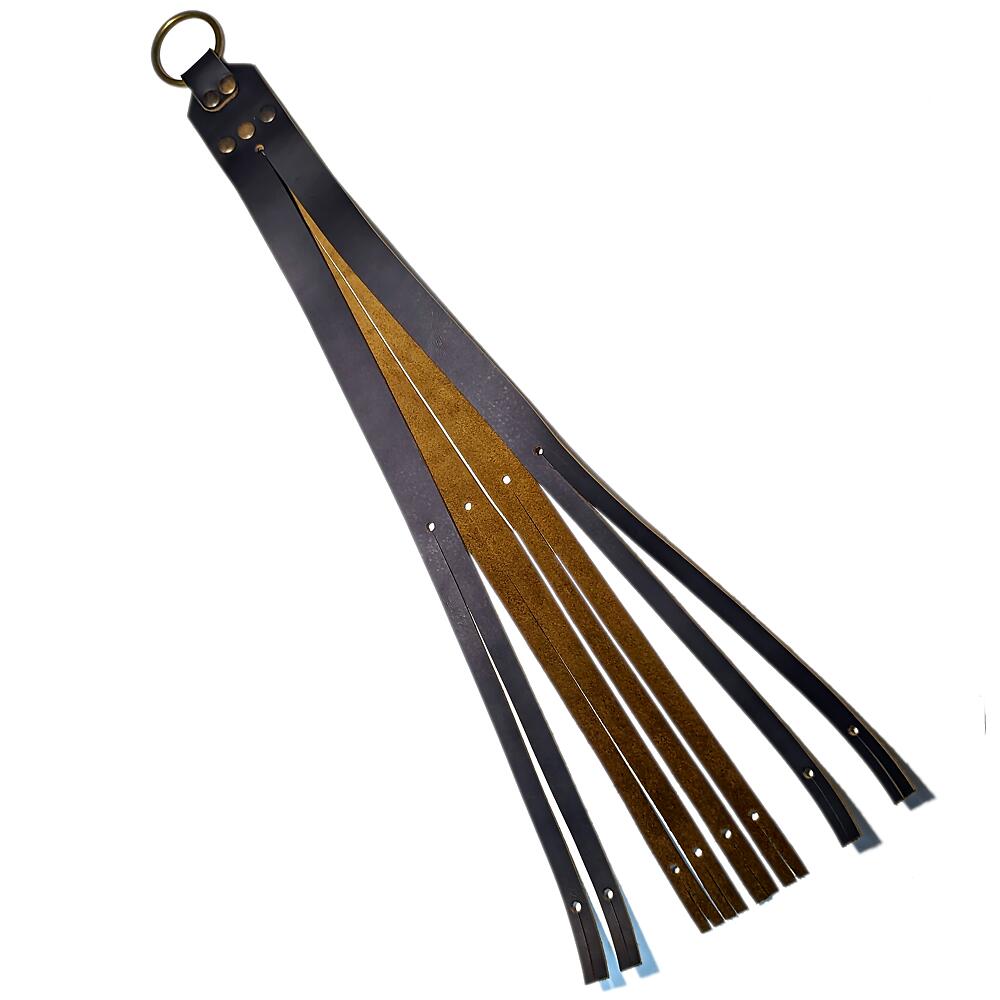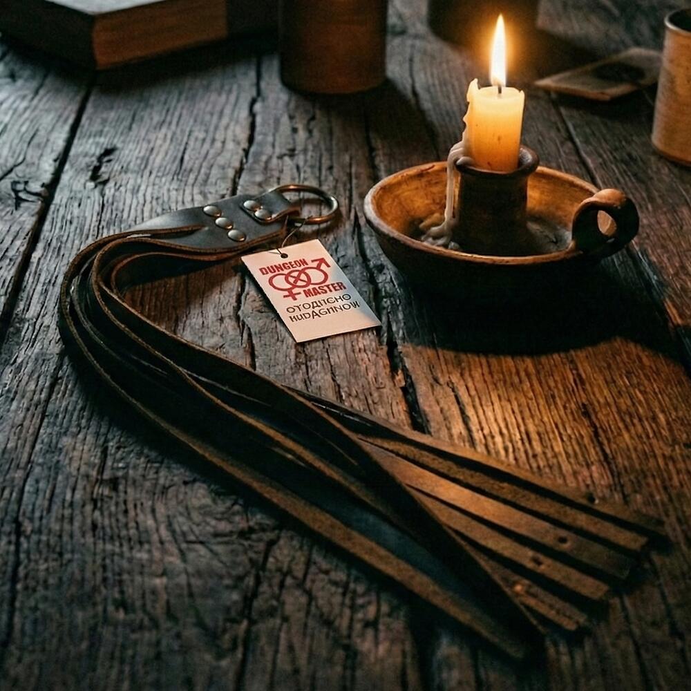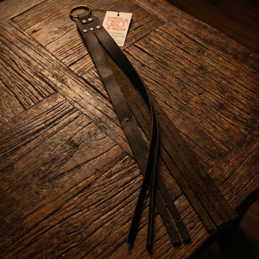 Плеть шириной 4 см и длиной 45 см, 8 хвостов. Изготовлена из мягкой кожи, снабжена кольцом.