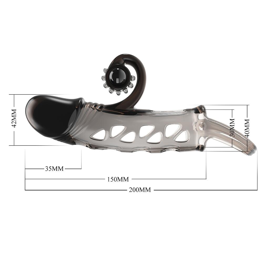 Вибронасадка на пенис – это отличное и безопасное средство увеличить половой член, продлив при этом секс и подарив партнерше новые эмоции. Она изготовлена из ТПЕ и фиксируется на месте с помощью петельки. Общая длина 20 см, длина без петельки — 15 см