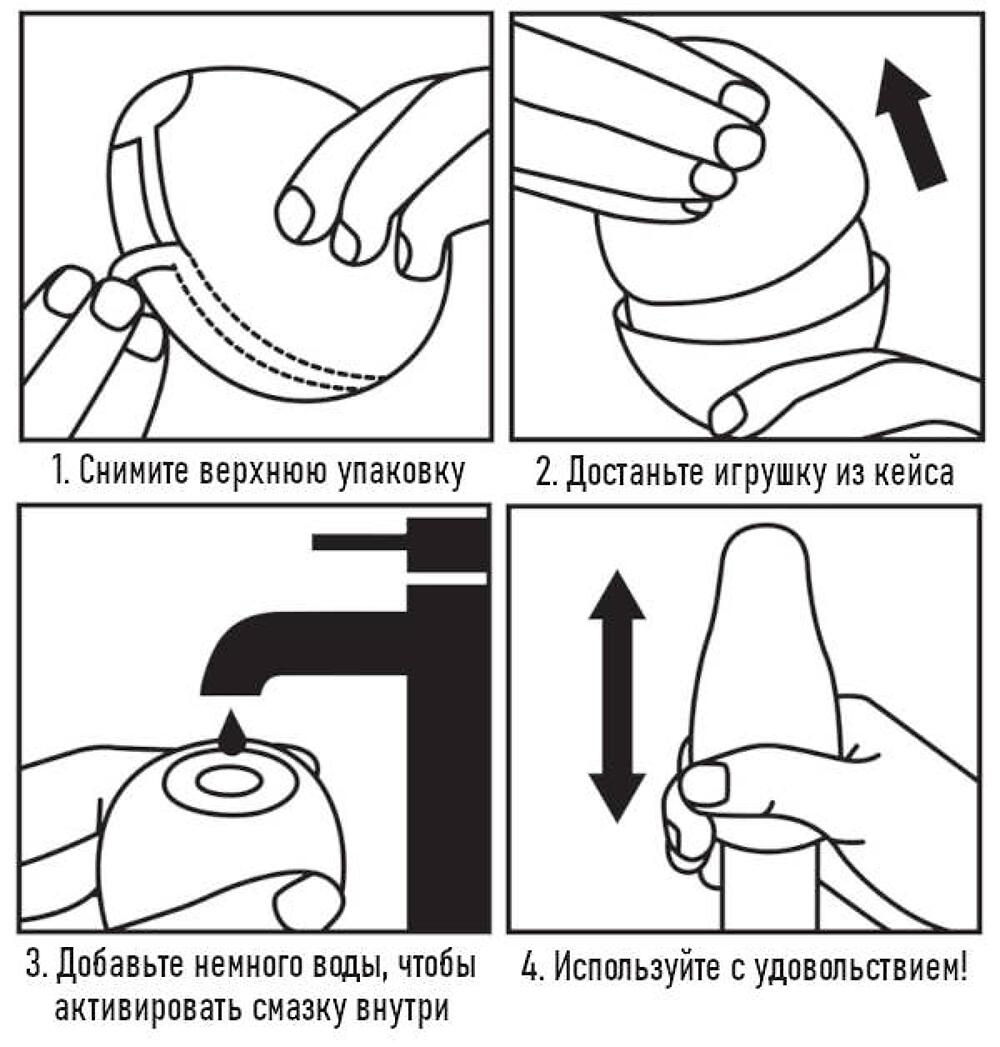 В использовании мастурбатор очень прост, откройте упаковку и добавьте внутрь несколько мл воды, наденьте яйцо на головку полового члена и потяните вниз до основания, повторяйте движения до получения оргазма, после мастурбатор можно выбросить.